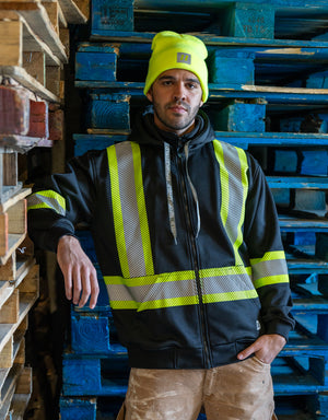 Enhance workplace safety with this high-visibility hoodie, featuring segmented reflective tape and a detachable double-layer hood. Constructed from deluxe 300 GSM fleece, it includes a kangaroo pocket, full-length zipper, rib-knit cuffs, and a heavy-duty elastic hem for ultimate comfort and visibility.