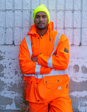 Stay safe and visible in any weather with our Fire Resistant Hi-Vis Safety Rain Jacket. Waterproof and durable with welded seams, it features a detachable hood with visor, vented underarms, secure storm cuffs, and practical front snap pockets.