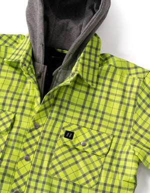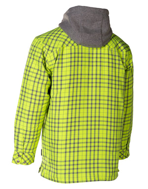 Hi Vis Lime Silver Micro Plaid Hooded Quilt-Lined Flannel Shirt Jacket